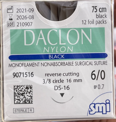 The term "DACLON NYLON BLACK 6/0" primarily refers to a specific type of surgical suture used in various medical procedures. It is a sterile, non-absorbable, monofilament thread extruded from polyamide 6.0 or 6.6.