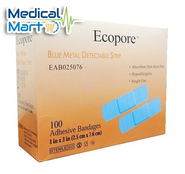 Ecopore Blue Metal Detectable Strip Bandage has centralized non-woven pad in combination with non-adherent film. Porous PE/PU film on the face of non-woven low adherence. Absorbent pad is backed by soft air-permeable, stretchable non-woven.