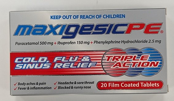 Maxigesic PE can be used to treat body pain, sore throat and symptoms of cold and flu .