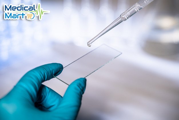 A thin flat piece of glass, typically 2.6cm x 7.5cm (1" x 3") and about 1mm thick, used to hold objects for examination under a microscope. Designed for single us by professionals.