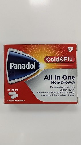 Panadol cold and flu All in One is used for cold and flu symptoms including headache, sore throat, nasal congestion, sinusitis and associated pain, body aches ,fever, chesty cough and sore throat.