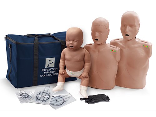 The Prestan Professional Collection consists of one (1) Adult Manikin, one (1) Child Manikin, and one (1) Infant Manikin (all manikins installed with Rate Monitor and Depth Clicker for CPR Feedback and AA batteries).