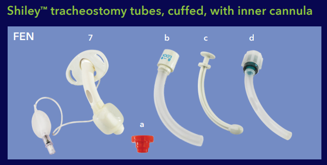 Tracheostomy tube, cuffed, with inner cannula, fenestrated (FEN) allows for weaning of patient from tube by facilitating upper airway breathing