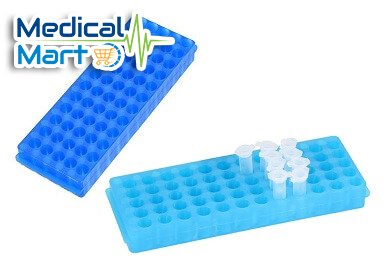 Double sided 60 well micro centrifuge tube rack holder has 5x12 layout. One side has 60 wells for holding 0.5ml microtubes, and the flip side has 60 wells for holding 1.5ml / 2ml nicro centrifuge tubes or screw cap freezer tubes.
