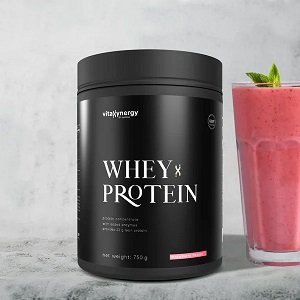 Strawberry flavoured, 72% protein and digestive enzymes containing powder with sweeteners. The product is aspartame free and provides 23 g lean protein per serving.